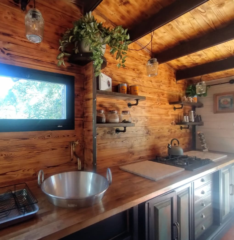 The rich wood walls and open shelves give it that handcrafted, tucked-away-in-the-woods feel, while the simple metal sink, warm lighting, and neatly stored jars keep the space functional and inviting.
