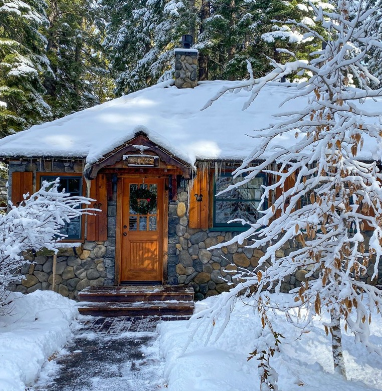 This enchanting stone cabin looks straight out of a winter fairytale—snow-covered roof, frosted trees, and a warm wooden door that feels impossibly inviting.
