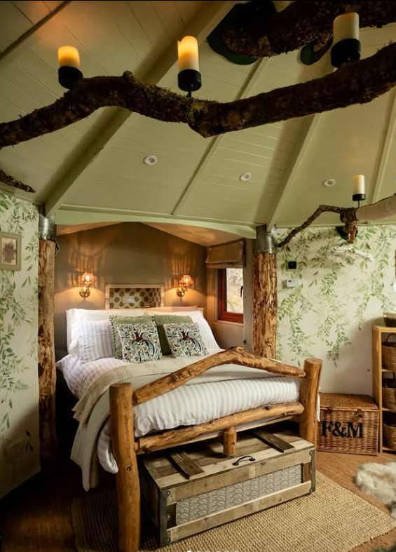 This magical cabin bedroom feels like stepping into a woodland retreat—complete with real tree-branch beams, warm candle-style lighting, and a handcrafted log bed that anchors the whole space in rustic charm.