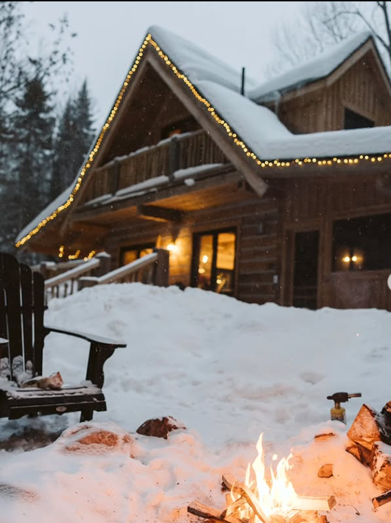 This enchanting winter cabin sets the perfect scene for a cold-weather getaway—twinkling lights tracing the roofline, warm golden glow spilling from the windows, and a crackling fire surrounded by fresh snow.