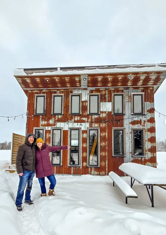 This unique rustic cabin—with its weathered metal exterior, tall modern windows, and cozy winter backdrop—creates the perfect off-grid snow escape.