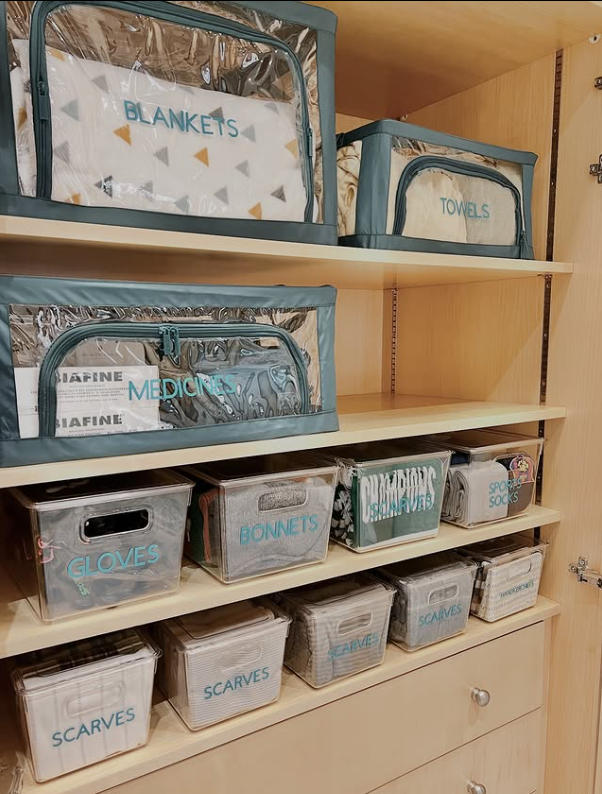 Labeled clear bins make it easy for kids and parents to find exactly what they need—whether it’s gloves, scarves, or school essentials.