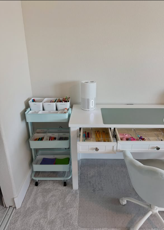 A rolling cart paired with labeled drawer organizers keeps school supplies neatly sorted and always within reach.