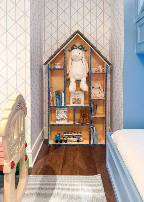 A dollhouse-shaped bookshelf doubles as playful décor and smart storage, keeping books, toys, and stuffed animals neatly displayed.