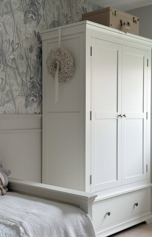 A classic white wardrobe offers plenty of hidden storage space for kids’ clothes, bedding, or toys while blending seamlessly with the room’s design.