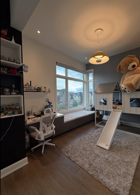 This playful bedroom combines fun and function—featuring a built-in desk for study, a cozy window bench with hidden storage, and a house-shaped bed that doubles as a play zone.
