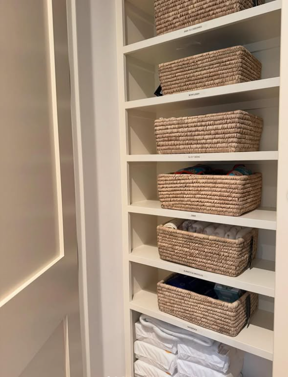 Keep everyday items like baby clothes, socks, and accessories neat with labeled woven baskets.