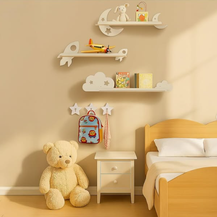 These rocket, moon, and cloud shelves double as décor while holding books, toys, or keepsakes.
