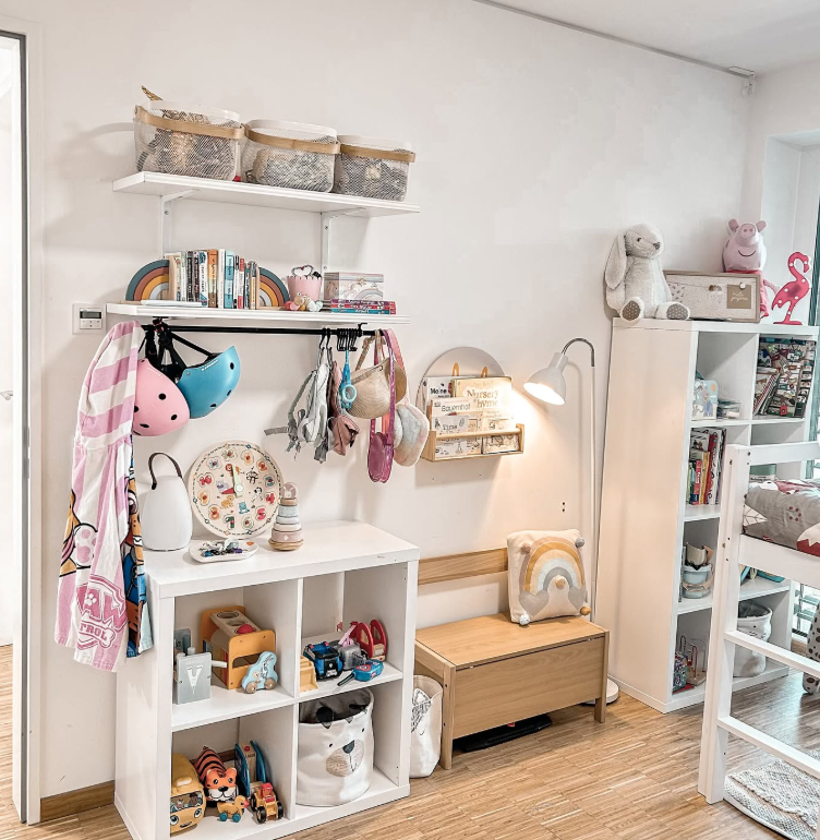 Wall shelves hold baskets for smaller items, while hooks are ideal for helmets, bags, and dress-up gear.