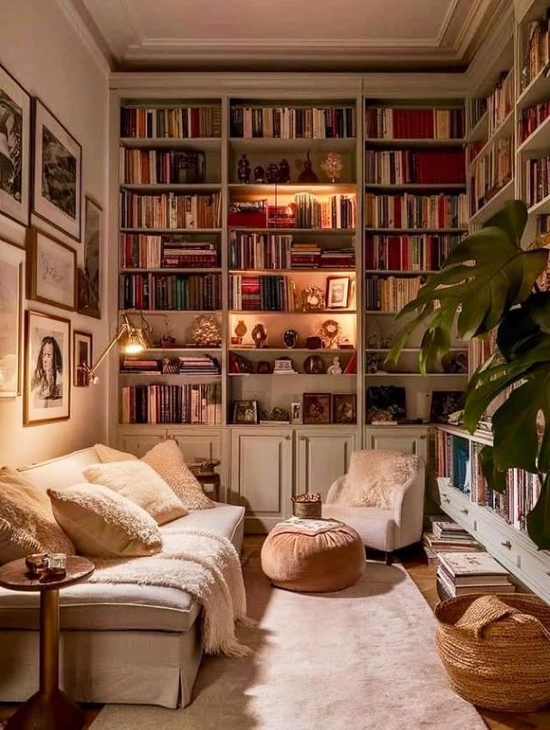 This dreamy home library has everything you need for a cozy reading escape—glowing shelf lighting, floor-to-ceiling books, plush seating, layered textures, and warm neutrals that make the whole space feel intimate and inviting.