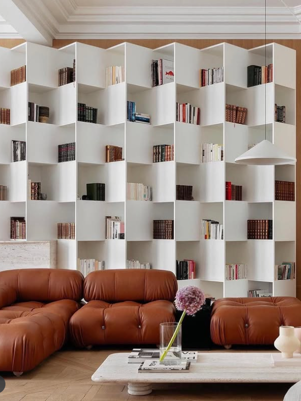 This modern home library pairs stunning geometric bookshelves with rich, tufted leather seating to create a sleek yet cozy reading retreat.