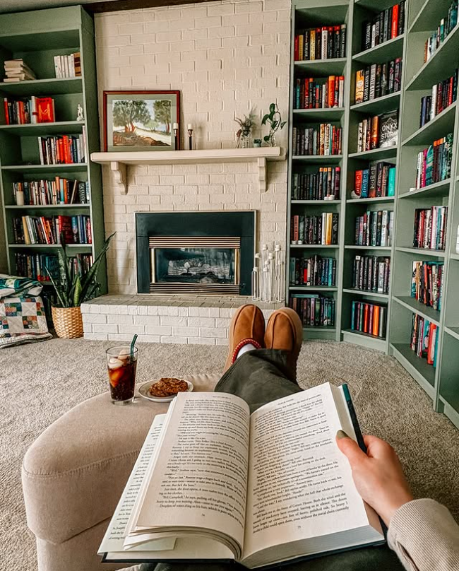 This cozy home library captures the perfect slow-living moment—feet up, book open, and a fireplace framed by beautiful built-ins.