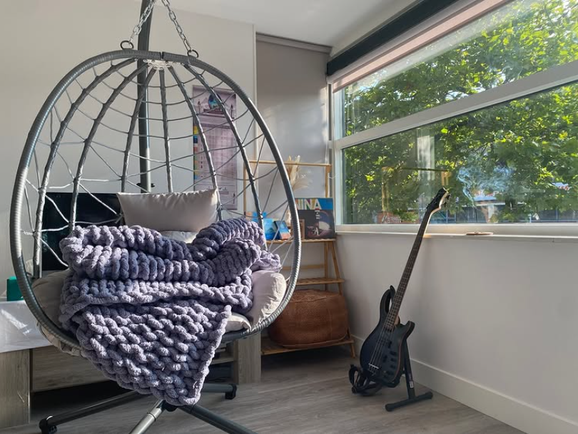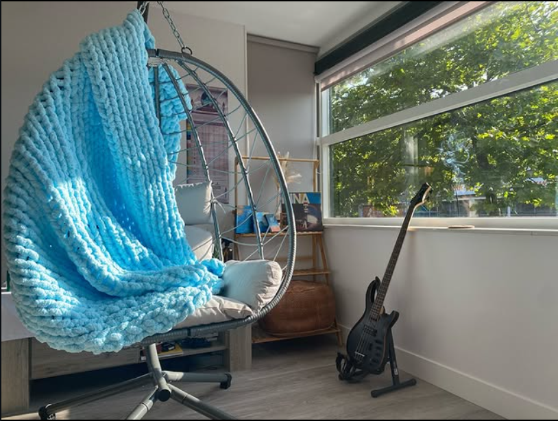 A chunky knit blanket instantly transforms this hanging chair into a cozy retreat.