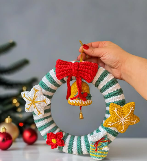 Hand-Knit Holiday Wreath with Festive Details