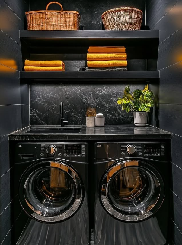 The sleek washing machines sit side by side, making it easy to sort and transfer laundry. Above them, woven baskets add a warm, inviting feel while providing storage for essentials. This clever use of space keeps everything organized and within reach.