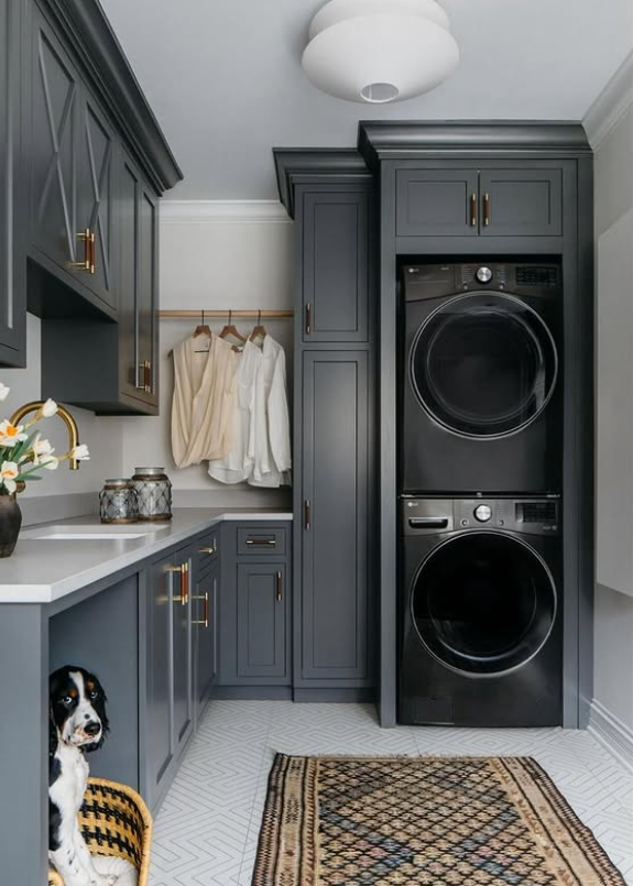 This sleek laundry room pairs deep navy cabinetry with crisp white appliances for a bold yet balanced look.