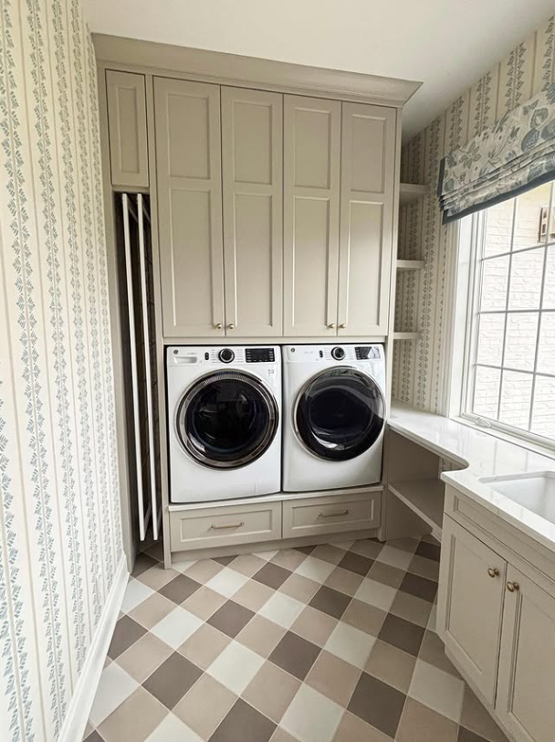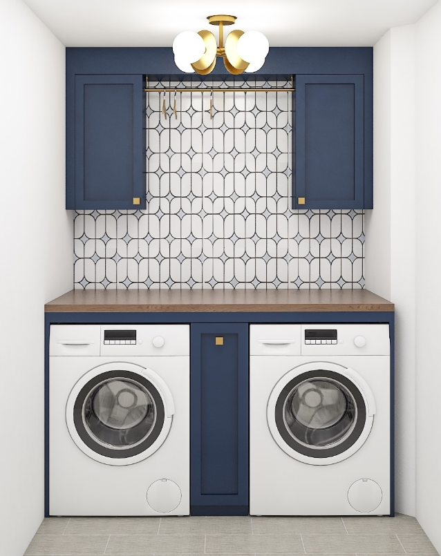 The patterned floor tiles add a playful element, breaking the monotony and drawing the eye. This thoughtful use of color and pattern elevates the laundry room from a simple utility space to a stylish area in the home.