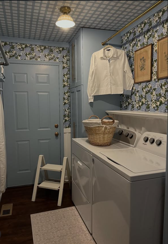 This cozy laundry room blends classic charm with everyday functionality, featuring vintage-style floral wallpaper and soft blue cabinetry that create a warm, nostalgic feel.