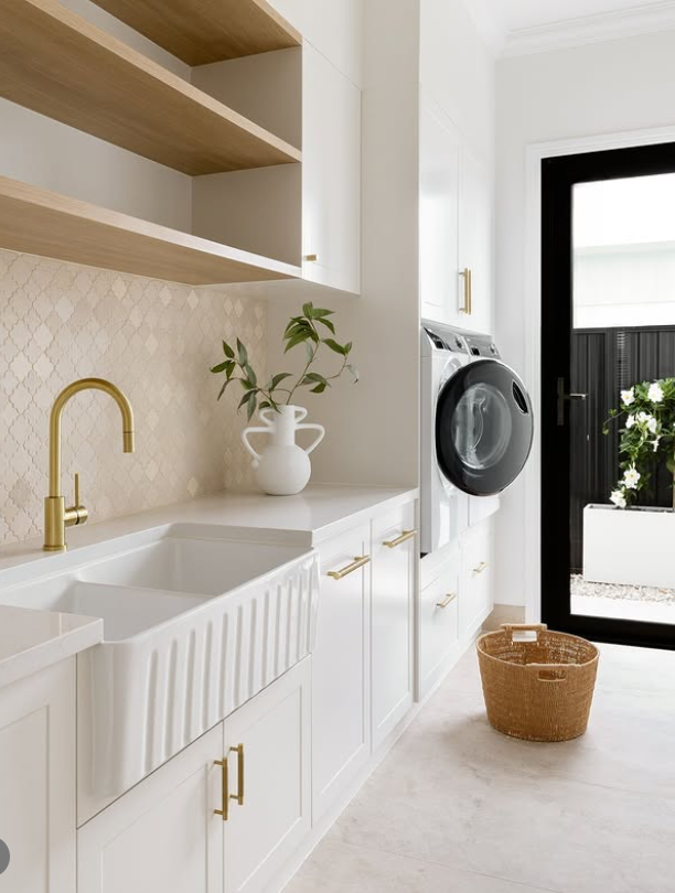 Bright White Laundry Room with Brass Accents and Farmhouse Sink