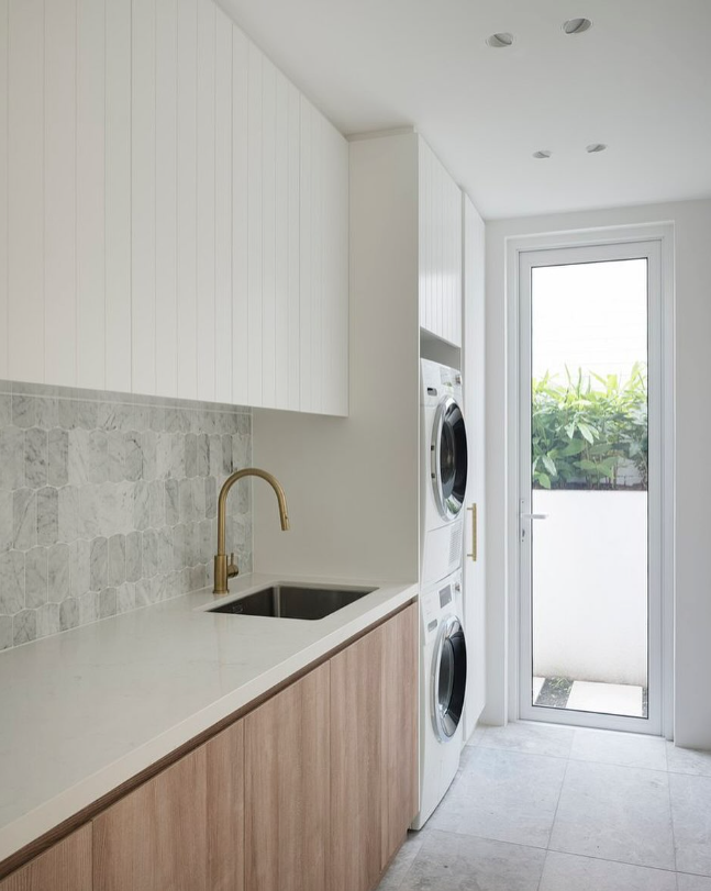Finished with a minimalist sink and refined fixtures, this space feels more like a boutique interior than a traditional laundry room.