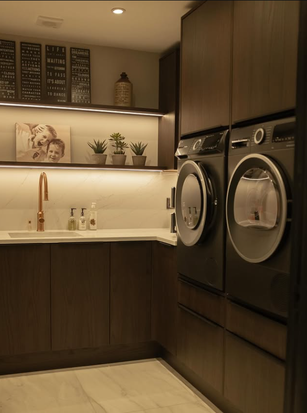 This elegant laundry room features rich wood cabinetry paired with integrated lighting that creates a warm, upscale atmosphere.
