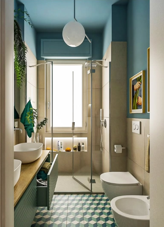 Glossy tile walls reflect light beautifully, while framed mirrors, greenery, and soft lighting create a calm, spa-like feel.