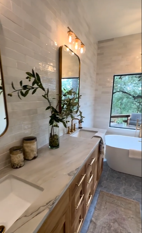 Paired with greenery, patterned flooring, and warm wood details, the walls help the bathroom feel modern, airy, and thoughtfully styled—perfect for a small but impactful refresh.