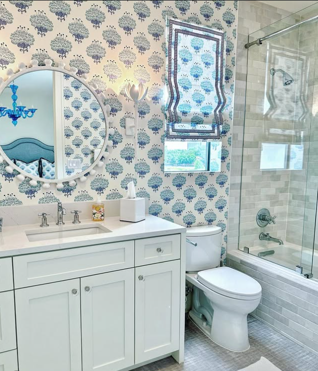 This charming bathroom uses patterned wallpaper to turn the walls into a standout feature.