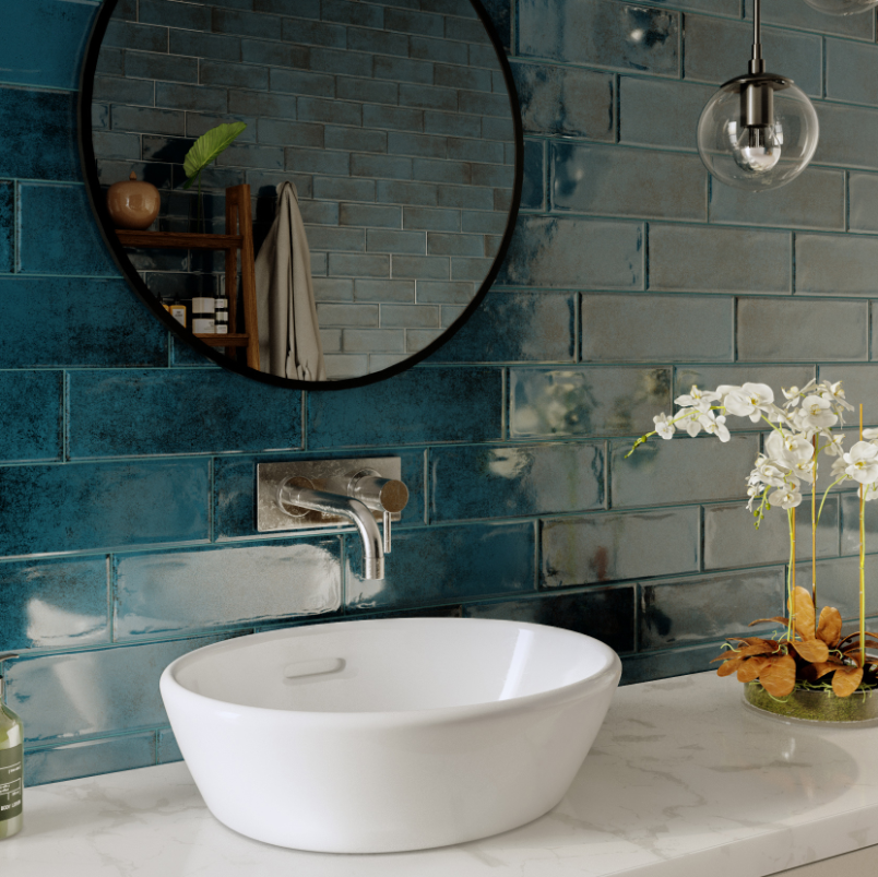 Statement Bathroom Wall Decor with Glossy Blue Tile