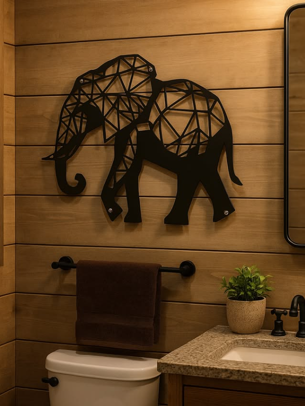 This bold bathroom wall décor features a striking geometric elephant wall art that adds personality and visual interest to the space.