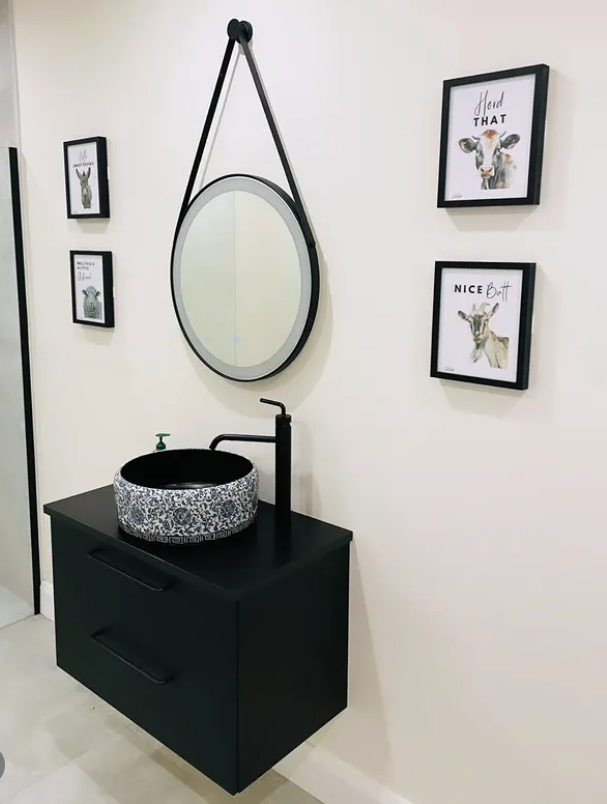 The rich colour pairs beautifully with a round mirror, sleek fixtures, and soft lighting, giving the space a modern, spa-inspired feel.
