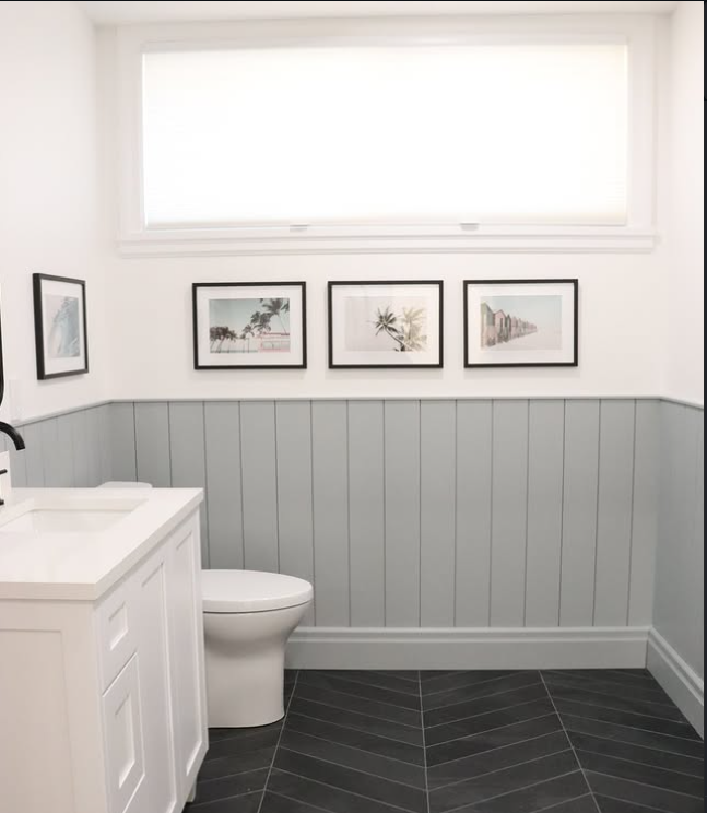 This bathroom showcases a calm, minimalist approach to wall décor with soft grey wainscoting and a clean white upper wall.