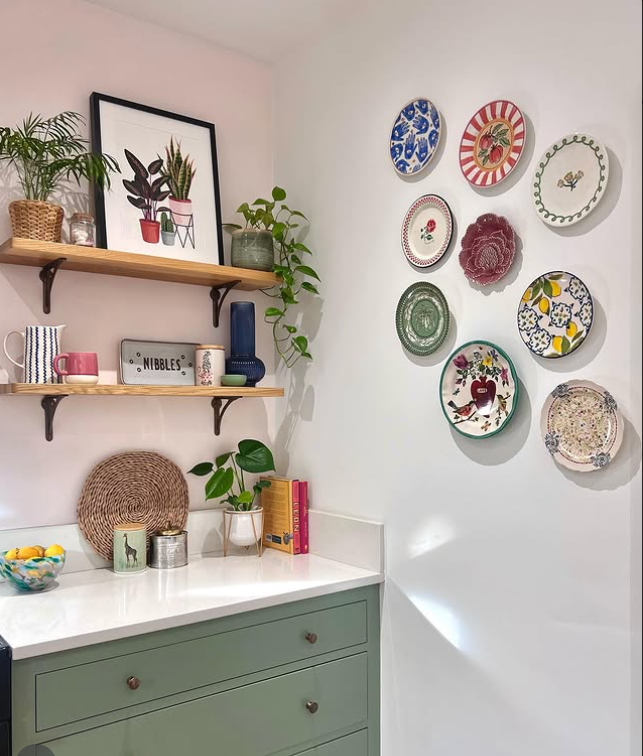 Patterned plates add colour and character, while wooden shelves styled with plants, artwork, and everyday pieces keep the look relaxed and lived-in.