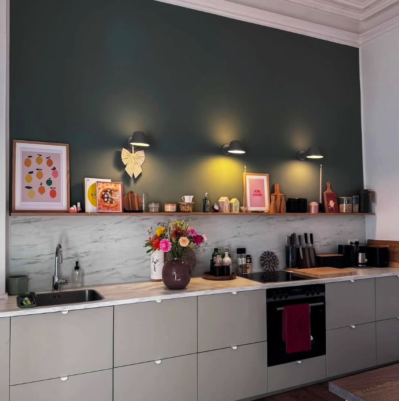 It’s a cosy, lived-in kitchen wall setup that feels welcoming and easy to style.