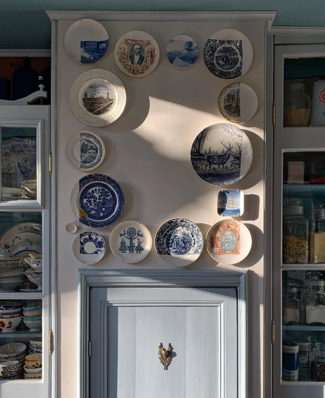 Styled against soft cabinetry, the plate wall becomes a charming focal point that elevates the entire kitchen space.