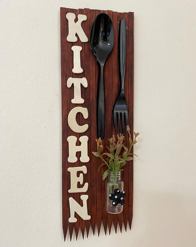 This playful kitchen wall décor adds a rustic farmhouse touch with an oversized utensil display and bold wooden lettering.
