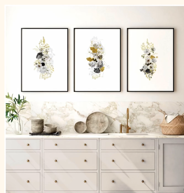 This clean and elegant kitchen uses a trio of minimal floral prints to create a soft, modern wall décor moment.