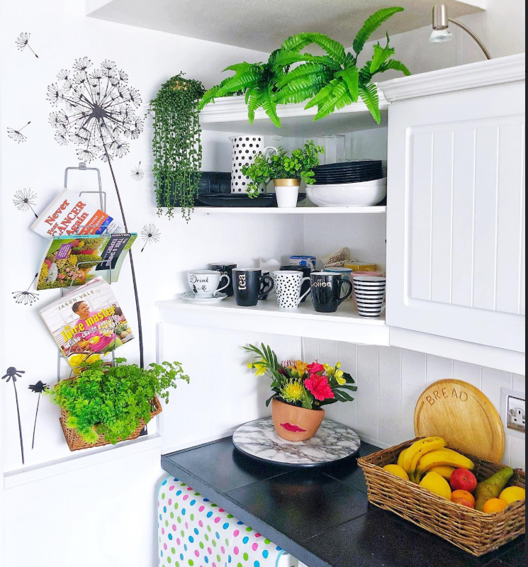 Styled with everyday dishes, cookware, and greenery, the space feels creative, lived-in, and full of character without feeling overwhelming.