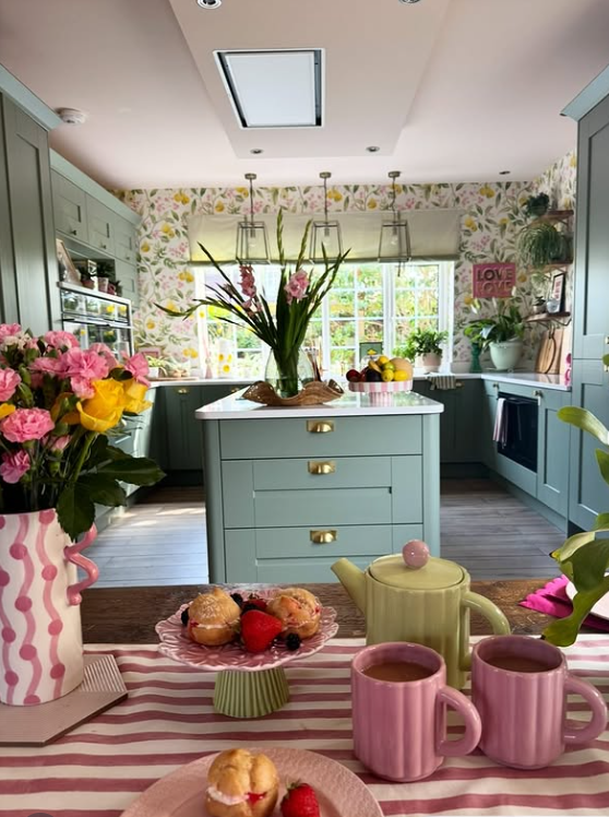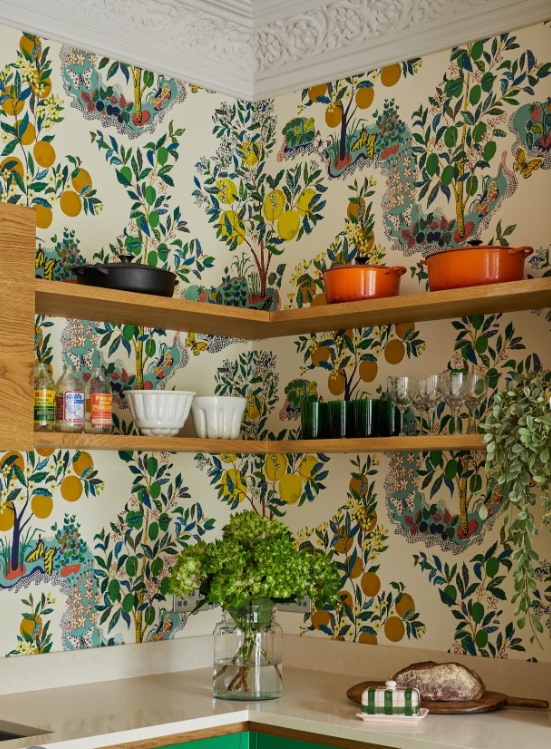 It’s a great example of how statement wallpaper can completely transform kitchen walls while still feeling cohesive and welcoming.
