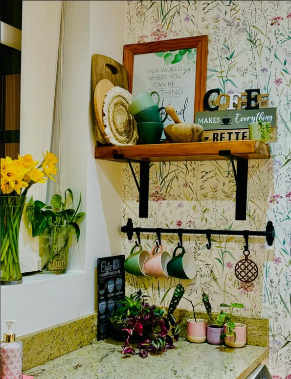 Warm wood tones, playful signage, and trailing greenery add personality, while floral wallpaper brings softness and visual interest.