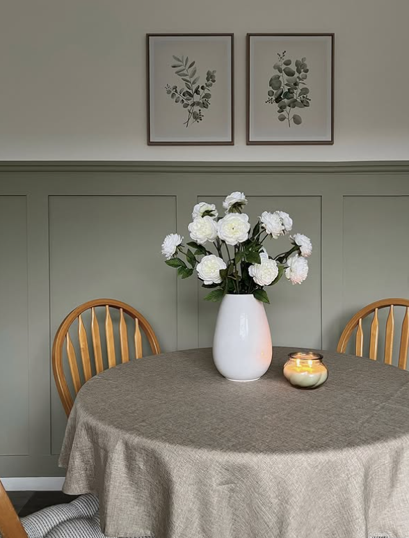 Framed botanical prints paired with muted green panelling create a balanced, relaxed backdrop for everyday meals.