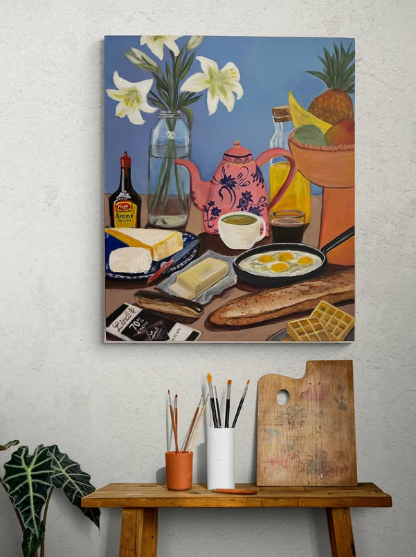 Bold colours, familiar food details, and hand-painted charm make the artwork a standout focal point, while simple styling below keeps the look balanced and creative.