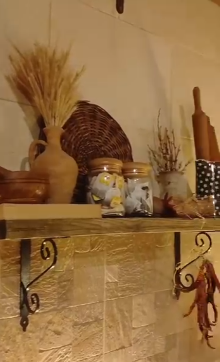 This cosy kitchen wall is styled with warm, rustic accents that add depth and character.